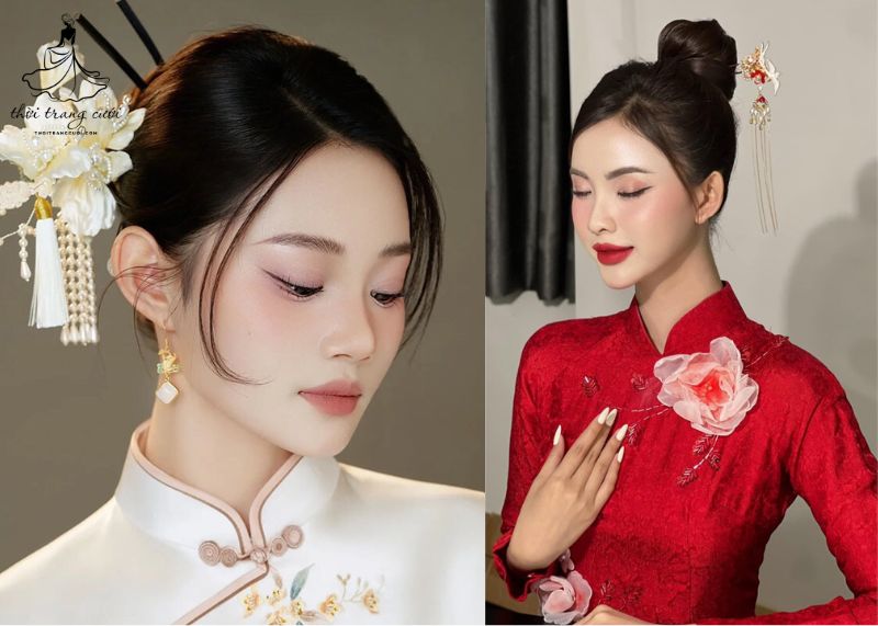 Đây là một trong các kiểu tóc cô dâu mặc áo dài cưới “an toàn” nhưng cực kỳ duyên dáng. Tóc được búi gọn ở gáy, có thể uốn cong phần mái hoặc để mái thưa để tạo nét mềm mại. Kiểu này phù hợp với các nàng theo phong cách thanh lịch, yêu thích áo dài nhung, gấm hoặc tông màu trung tính.