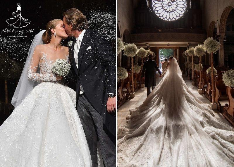Là người kế thừa đế chế pha lê danh tiếng, Victoria Swarovski đã làm giới mộ điệu choáng ngợp với bộ váy cưới trị giá 23 tỷ đồng. Thiết kế nặng đến 45kg, đính thủ công nửa triệu viên pha lê Swarovski, mang lại hiệu ứng ánh sáng lấp lánh như được chạm khắc từ băng tuyết.